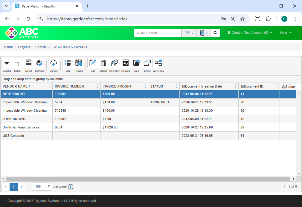 Click anywhere in the desired row to view the document