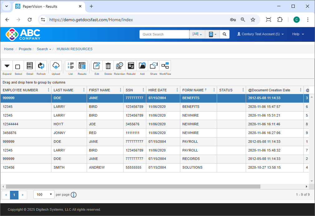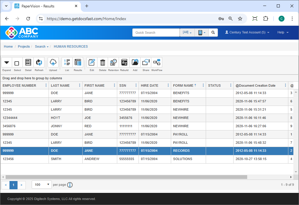 Click anywhere in the desired row to view the document